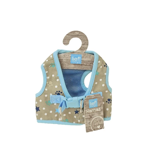 With the lief! Dog Harness, you will have more control over your dog while walking. What’s more, the harness takes the strain off your dog’s back and neck when there is tension on the leash. The beige harness is finished with light blue edges and has a cheerful print with spots, stars and paw prints. You can easily put the harness on your dog and fasten it with the click straps. The leash can be attached to the two D-rings.